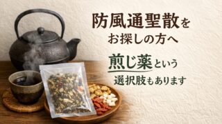 防風通聖散をお探しの方へ。当店では、防風通聖散・大柴胡湯・防已黄耆湯の煎じ薬を通販でご用意しています。錠剤や顆粒ではなく、煎じ薬を試したい方は商品ページをご覧ください。