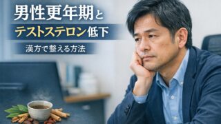 男性更年期(LOH症候群)とテストステロン低下の関係を解説。疲労・意欲低下・不眠などの背景を整理し、漢方で体質から整える考え方と代表的な漢方薬、生活改善のポイントまで丁寧に紹介します。